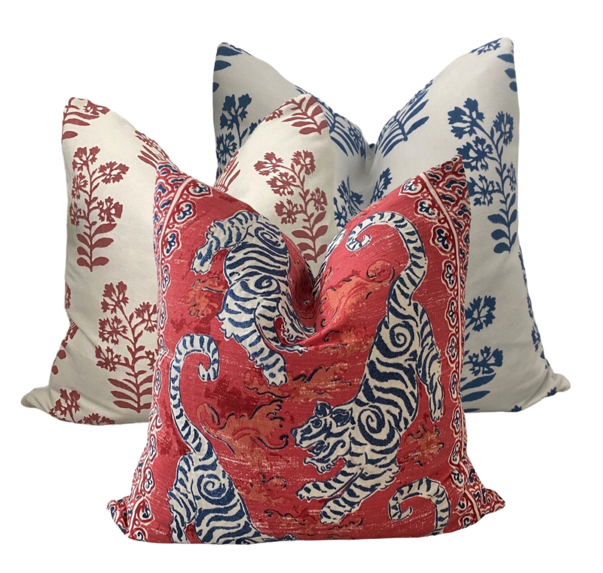 Red Fleur is washed floral pattern, hand blocked. The pillows have the same linen-cotton blend fabric on both sides. Sewn with a hidden zipper closure at the bottom, serged interior seams and tapered corners.
