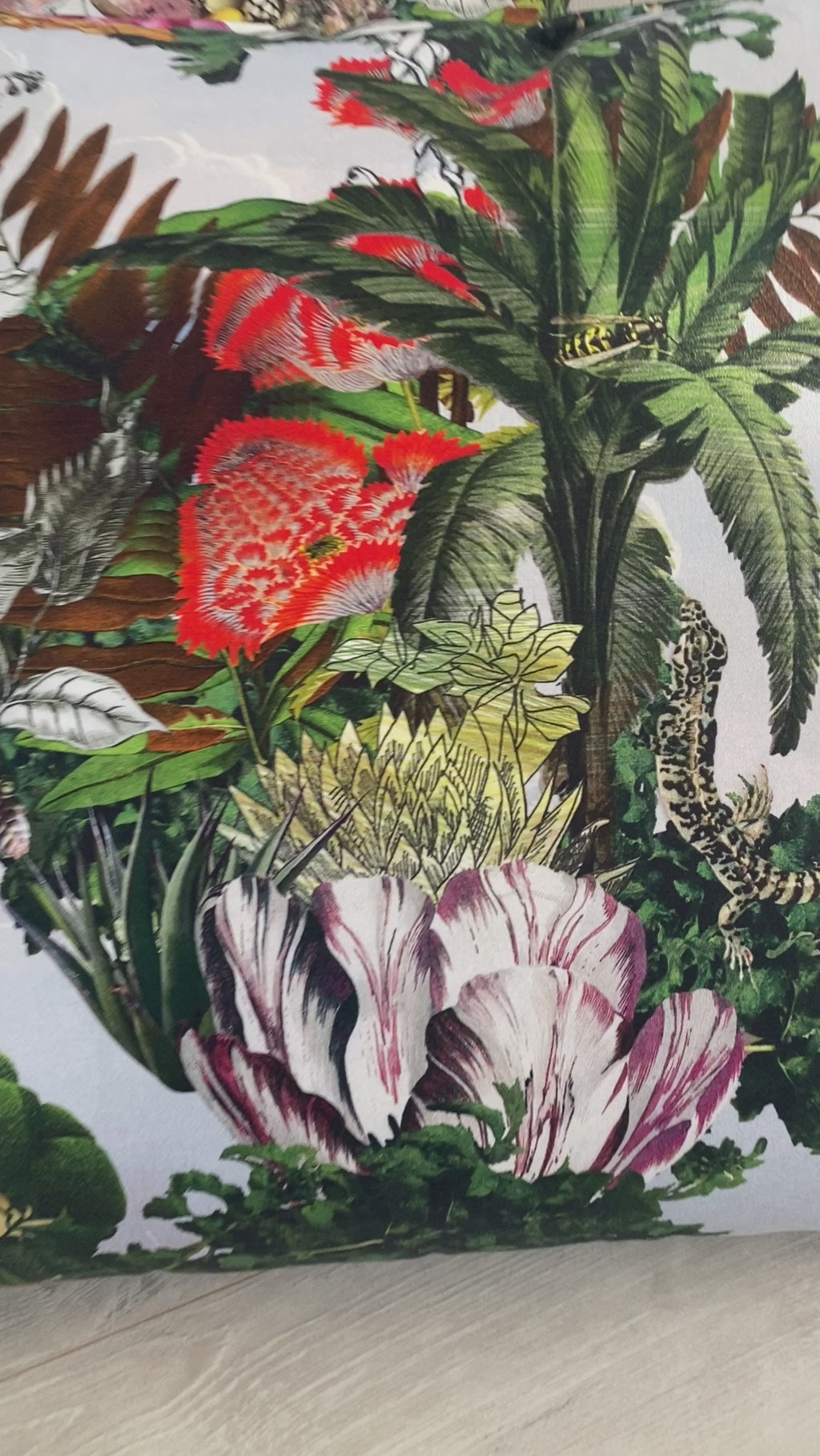 Not for the faint of heart, custom pillows made with this wonderful Christian Lacroix tropical,and whimsy fabric. The background color is hard to portray in a photo. It is a very pale icy lavender-blue making for an unusual sky that is a stunning backdrop for the floral and botanical images.